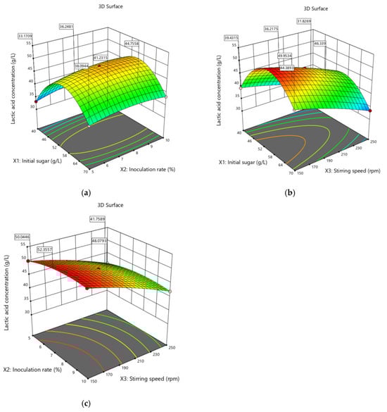 3D response surface plots showing interactive effects of process variables on lactic acid production: (a) Initial sugar concentration and inoculation rate; (b) Initial sugar concentration and stirring speed; (c) Inoculation rate and stirring speed. The surface color gradient represents lactic acid concentration (g/L), with red/yellow indicating higher and green/blue lower concentrations.