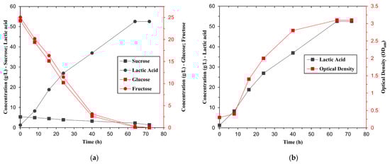 The optical density increased steadily during the early phase but decreased slightly as lactic acid accumulated, confirming that product inhibition begins to affect biomass above 40 g/L lactic acid. These results are consistent with known lactic acid toxicity thresholds in homo- and heterofermentative Lactobacillus strains and suggest that in situ product removal could further improve productivity at scale [,,].