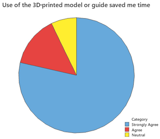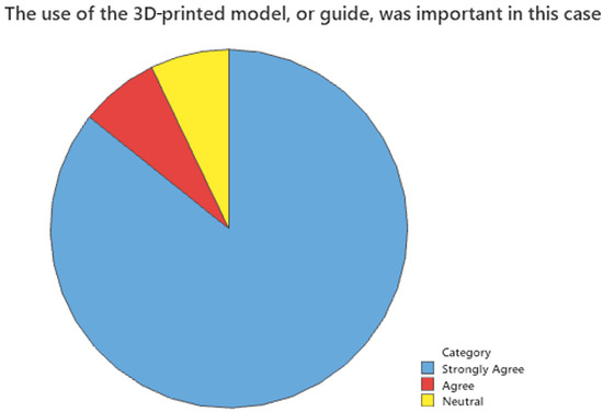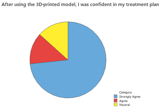 Figure 4 show the results of this survey. Most providers (85.7%) felt that the use of 3D-printed models or guides was important to their case. Similarly, 80% responded that the use of a 3D-printed model or guide saved them time, and another 73.3% responded that after using the 3D-printed model, they were confident in their treatment plan.