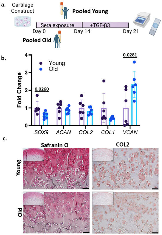 (a) Schematic describing experimental setup. (b) Real-time PCR was used to measure the relative gene expression of SOX9, ACAN, COL2, COL1, and VCAN. Data were normalized to the mean of the younger-sera-treated group (set as 1). n = 6 technical replicates per group. Unpaired t-test with Welch’s Correction was used for statistical analysis, and p-values are presented over the bars. (c) Safranin O staining COL2 IHC (Scale bar = 100 μm).
