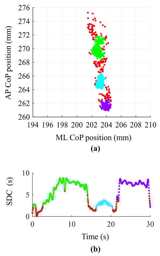 Cluster analysis and the Sway Density Curve (SDC). (a) The statokinesigram (Antero–Posterior (AP) position versus Medio–Lateral (ML) position of the Centre of Pressure (CoP)) of one representative subject with MS under the Eyes Open (EO) condition before the Exoskeleton training (pre-Exo). Referred to this trial, the dbscan function identified, on the statokinesigram, three clusters (green, light blue, and violet dots) considered as the areas of stability. The red dots are the outliers identified by the dbscan algorithm. (b) The SDC curve of the same trial depicted in Panel (a). The CoP samples classification obtained by the cluster analysis is superimposed to the SDC curve in order to compute the period of instability (paled coloured rectangles) of this trial.