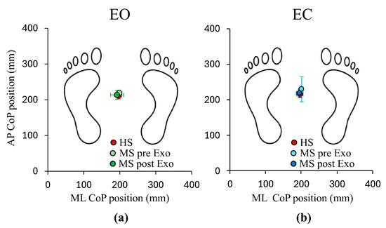 Figure 3 shows the mean CoP position on the base of support, calculated separately for the subjects with MS and HSs, under both EO (Panel (a)) and EC (Panel (b)) conditions. During the pre-Exo evaluation (filled light green (EO) and blue (EC) circles), under both visual conditions, the mean CoP position in the group of subjects with MS was very close to that of the HS group (filled red circles, Panels (a,b)) and just a little further ahead under EC condition (Panel (b)). After the exoskeleton training the mean CoP position of the subjects with MS group (filled dark green (EO) and blue (EC) circles) were superimposable to that of HS group under both EO and EC conditions.