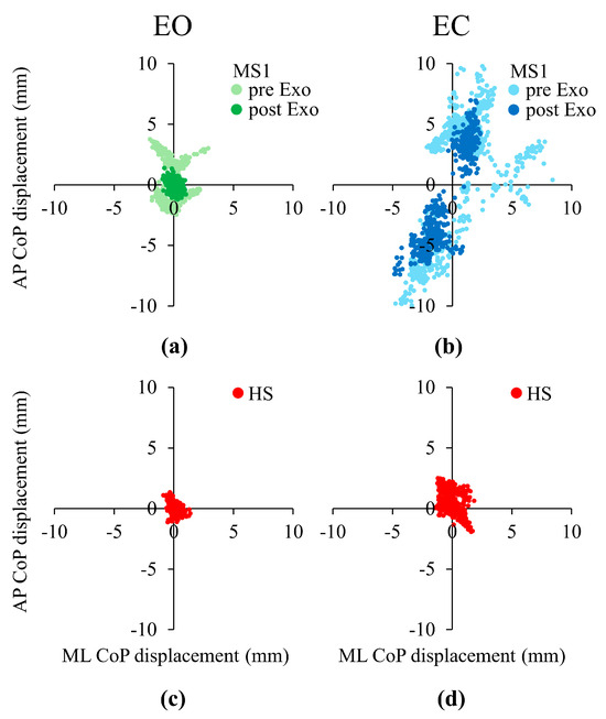A clear example of the sway behavior of the individuals with MS before pre- and post-Exo training is shown in Figure 4, where the statokinesigrams under EO (Panel (a)) and EC (Panel (b)) conditions are exemplified for one representative subject with MS (MS1). For comparison, the statokinesigram of one representative healthy subject is shown under both EO (Panel (c)) and EC (Panel (d)) conditions. In this Figure, to help the visual comparison between the pre- and post-Exo training data and between these latter data and that of the healthy subject, the instantaneous CoP position was plotted with respect to the mean CoP position of each trial. As shown in the Figure, individual MS1 exhibits greater postural sway compared to the healthy subject in both the AP and ML directions and under both visual conditions (compare Panel (a) with (c) and Panel (b) with (d)) in the pre-Exo EO, and in both pre- and post-Exo EC. Furthermore, after the exoskeleton training the area covered by the CoP decreased in both visual conditions, indicating improved postural control.