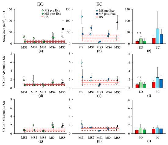 In panels (a,b) (mean Sway Area data), (d,e) (mean SD CoP along AP axis), and (g,h) (mean SD CoP along ML axis) the light green and light blue filled circles represent the mean pre-exoskeleton (pre-Exo) evaluation data for individuals with MS, while the dark green and dark blue filled circles represent the post-exoskeleton (post-Exo) evaluation data. Individual mean data for each subject with MS is shown separately. The grey and black filled circles correspond to the pre-Exo and post-Exo evaluations data of subject MS5, who was excluded from the group average calculations as their training sessions were not completed. The red line indicates the mean value across healthy subjects (HSs), and the red dotted lines represent the mean ± Standard Deviation (SD). In Panels (c) (mean Sway Area), (f) (mean SD CoP along the AP axis), and (i) (mean SD CoP along the ML axis), the red bars indicate the mean across HSs, the green bars (light and dark) represent the mean across individuals with MS under the Eyes Open (EO) condition (pre- and post-Exo, respectively), and the blue bars (light and dark) represent the mean across individuals with MS under the Eyes Closed (EC) condition (pre- and post-Exo, respectively). Asterisks indicate significant differences (*, p < 0.05). EO, Eyes Open; EC, Eyes Closed; CoP, Center of Pressure; AP, Antero–Posterior; ML, Medio–Lateral; HS, healthy subject; MS, Multiple Sclerosis; Exo, Exoskeleton; and SD, Standard Deviation.