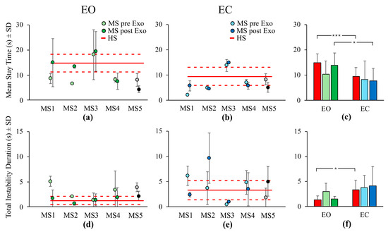 In panels (a,b) (mean Stay Time), (d,e) (mean Total Instability Duration), the light green and light blue filled circles represent the mean pre-exoskeleton (pre-Exo) evaluation data for individuals with MS, while the dark green and dark blue filled circles represent the post-exoskeleton (post-Exo) evaluation data. Individual mean data for each subject with MS is shown separately. The grey and black filled circles correspond to the pre-Exo and post-Exo data of the subject MS5, who was excluded from the group average calculations as their training sessions were not completed. The red line corresponds to the mean value across HSs and the red dotted lines represent the mean ± SD. In panels (c) (mean Stay Time) and (f) (mean Total Instability Duration), the red bars indicate the mean across HSs, the green bars (light and dark) represent the mean across individuals with MS under EO condition (pre-Exo and post-Exo, respectively) and the blue bars (light and dark) represent the mean across individuals with MS under EC condition (pre-Exo and post-Exo, respectively). Asterisks indicate significant differences (*, p < 0.05; ***, p < 0.001). EO, Eyes Open; EC, Eyes Closed; HSs, healthy subjects; MS, Multiple Sclerosis; Exo, Exoskeleton; SD, Standard Deviation.