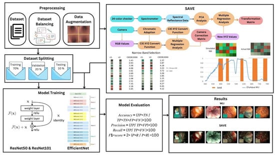 These preprocessing and augmentation strategies helped to optimize the dataset, enabling dependable approaches that support the training and evaluation of deep learning models. A brief workflow of the research is depicted in Figure 1. This figure illustrates the detailed process of the SAVE algorithm, from data acquisition to model evaluation. The workflow begins with the collection of raw white light imaging (WLI) data, followed by preprocessing steps such as resizing, cropping, and normalization of images to standard dimensions suitable for deep learning models. Data augmentation techniques, including rotations, shearing, zooming, and flipping, are employed to enhance dataset diversity and improve model robustness. The SAVE algorithm then applies spectral reconstruction techniques, leveraging polynomial regression and principal component analysis (PCA) for hyperspectral imaging (HSI) conversion. Narrow-band imaging (NBI) simulation is also performed to highlight vascular and mucosal features critical for GI disease diagnosis. The enhanced images undergo evaluation using deep learning architectures, including ResNet-50, ResNet-101, EfficientNet-B2, EfficientNet-B5, and EfficientNetV2-B0, to classify six key GI conditions. Performance metrics such as accuracy, precision, recall, and F1-score are calculated to compare SAVE-enhanced images with conventional WLI. The final output demonstrates the effectiveness of SAVE in improving diagnostic accuracy across various GI disease classes.