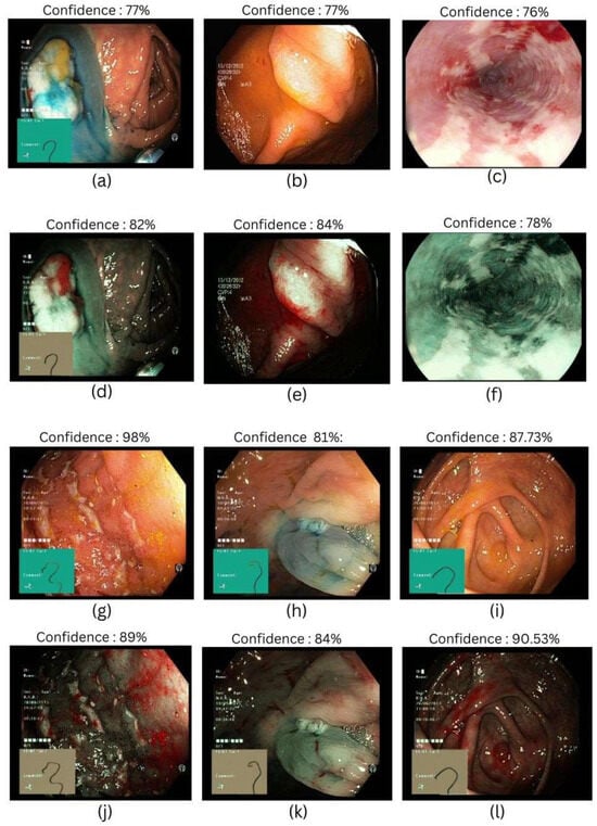 Different classes of gastrointestinal diseases were used in this study. (a,d) Represent dyed-lifted-polyps in WLI and SAVE, respectively; (b,e) represent polyps in WLI and SAVE, respectively; (c,f) represent esophagitis in WLI and SAVE, respectively; (g,j) represent ulcerative colitis in WLI and SAVE, respectively; (h,k) represent dyed-resection margins in WLI and SAVE, respectively; and (i,l) represent normal classes in WLI and SAVE, respectively.