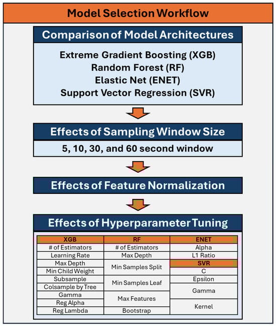The selection of ML models was guided by the need to balance model interpretability, computational efficiency, and performance. As such four models architectures were evaluated: Extreme Gradient Boosting (XGB) [23], Random Forest (RF) [24], Elastic Net (ENET) [25], and Support Vector Regression (SVR) [26]. Each of these models offers distinct advantages described below that align with the objectives of this study and the characteristics of the dataset. The process used for down-selection of model architectures and model hyperparameters is diagrammed in Figure 1 and the hyperparameters are described in Table 1.