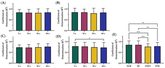 Comparison of Coefficient of Determination (R2) scores for different sampling window configurations. Four sampling windows—5, 10, 30, and 60 s—were compared for (A) XGB, (B) RF, (C) ENET, and (D) SVR. (E) Comparison of optimal model configurations based on sampling window. Results are shown as mean values (n = 23 replicates) with error bars denoting standard deviation. Statistical differences are shown when present (p-value less than 0.05 [*], 0.01 [**], and 0.001 [***]) based on Friedman test, post hoc Dunn’s multiple comparison tests.