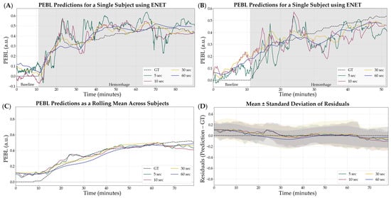 Effect of sample window size on ENET model performance. Four different sampling window sizes were evaluated—5, 10, 30, and 60 s—compared against calculated GT estimates. (A,B) Representative single subject results for PEBL vs. time during the baseline and hemorrhage scenarios. (C) Average results for ENET for all swine subjects (n = 23) for each sample window size and ground truth. (D) Average residuals across all subjects (n = 23) for ENET models, with shaded regions denoting standard deviation, black dashed line represents zero, a perfect prediction.