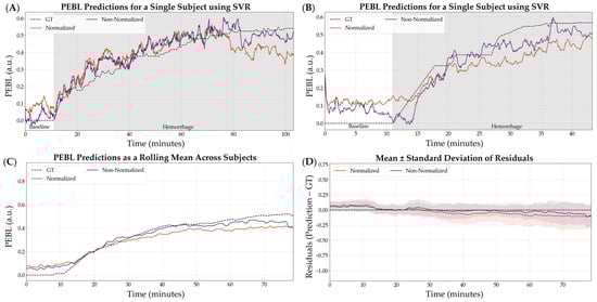 Effect of normalization vs. non-normalization on the SVR model performance using a 5 s feature window. (A,B) Representative single subject results for PEBL vs. time during baseline and hemorrhage states for normalized and non-normalized configurations with the ground truth. (C) Average results for SVR for all swine subjects (n = 23) for normalized and non-normalized configurations with the ground truth. (D) Average residuals across all subjects (n = 23) for SVR models, with shaded regions denoting standard deviation and black dashed line at zero representing a perfect prediction.