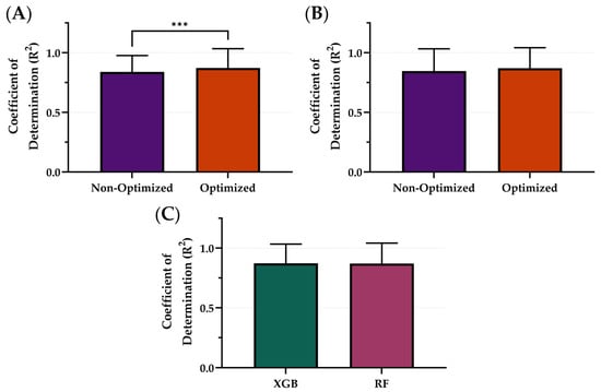 Comparison of Coefficient of Determination (R2) scores with and without optimization for different model types. The effects of optimization for (A) XGB and (B) RF. (C) Comparison of optimal model configurations for each. Results are shown as mean values (n = 23 replicates) with error bars denoting standard deviation. Statistical differences are shown when present (p-value less than 0.001 [***]) based on Wilcoxon matched-pairs ranked test.