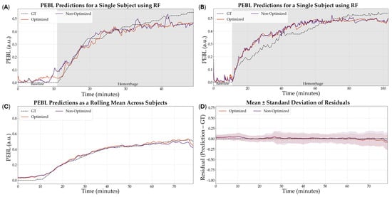 Effect of hyperparameter tuning on RF model performance. (A,B) Representative single subject results for PEBL vs. time during baseline and hemorrhage scenarios for the Bayesian optimized and non-optimized configurations along with the ground truth. (C) Average results for RF for all swine subjects (n = 23) for the Bayesian optimized and non-optimized configurations. (D) Average residuals across all subjects (n = 23) for RF models, with shaded regions denoting standard deviation, the black dashed line at zero represents perfect predictions.
