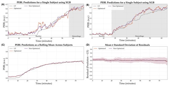 Effect of hyperparameter tuning on the XGB model performance. (A,B) Representative single subject results for PEBL vs. time during baseline and hemorrhage scenarios for the Bayesian optimized and non-optimized configurations with the respective ground truth. (C) Average results for XGB for all swine subjects (n = 23) for the Bayesian optimized and non-optimized configurations. (D) Average residuals across all subjects (n = 23) for XGB models, with shaded regions denoting standard deviation, the black dashed line at zero represents perfect predictions.