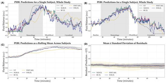 Results of all models to predict fluid balance during hemorrhage and resuscitation. (A,B) Representative single subject results for PEBL vs. time during the baseline, hemorrhage, and resuscitation staged with the respective ground truth. (C) Average results for all models for all swine subjects (n = 23) across the entire study. (D) Average residuals across all subjects (n = 23) for all models, with shaded regions denoting standard deviation and the black dashed line at zero represents perfect predictions.