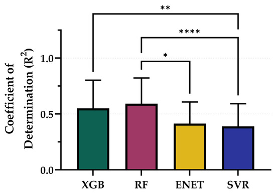 Comparison of Coefficient of Determination (R2) scores for each model across the entire study paradigm. Results are shown as mean values (n = 23 replicates) with error bars denoting standard deviation. Statistical differences are shown when present (p-value less than 0.05 [*], 0.01 [**], and 0.0001 [****]) based on Friedman test, post hoc Dunn’s multiple comparison tests.