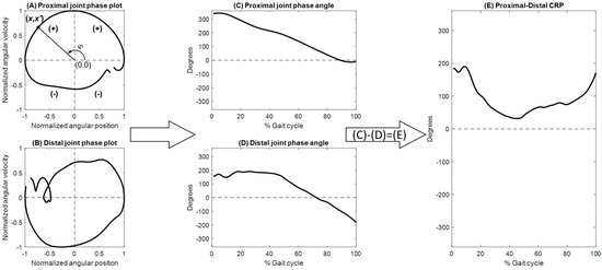 Schematic illustration of the analytical process for computing continuous relative phase (CRP). (A,B) depict the phase plots of the proximal and distal joints, respectively. (C,D) present the corresponding phase angles of the proximal and distal joints across the gait cycle, respectively. (E) shows the CRP profile obtained as the difference between the proximal and distal joint phase angles (C,D).