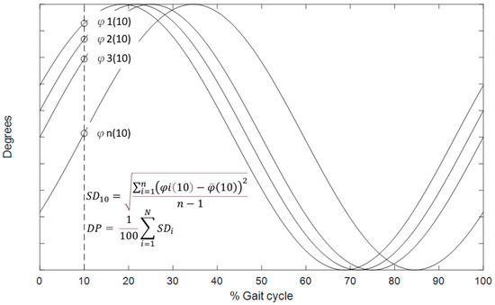 Schematic illustration of the computation of deviation phase (DP) values. At each time point of the gait cycle, the standard deviation (SDi) of continuous relative phase (CRP) values across multiple trials is calculated. The DP value is then obtained as the time-averaged standard deviation over the entire gait cycle, representing the variability of the CRP profiles.