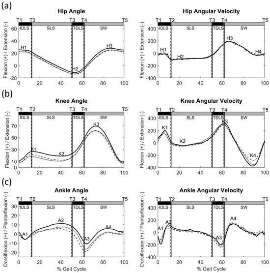 Ensemble−averaged angles (°) and angular velocities (°/s) of (a) the hip, (b) knee and (c) ankle of the affected limb (black, solid line) and unaffected limb (black, dotted line) in the DDH group and Control group (grey, solid line) during level walking. T1: Heel strike; T2: Contralateral toe off; T3: Contralateral heel strike; T4: Toe off; T5: Subsequent heel strike; H1−H4: Peaks and troughs in the hip curves; K1−K4: Peaks and troughs in the knee curves; A1−A4: peaks and troughs in the ankle curve.