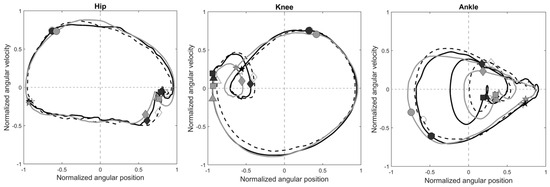 To generate the phase plots of the joints, the joint angular displacements were normalized to a range between −1 and 1, centered at zero. The angular velocity values were normalized based on the maximum absolute velocity over the gait cycle [11]. These normalization procedures are helpful in reducing the influence of different movement amplitudes and frequencies [28]. For each joint, a phase plot was generated by plotting the normalized angular velocities (x’) against the normalized angular displacements (), and the angle from the positive x-axis to the ray from the origin to the point (x, x’) calculated using the 2-argument arctangent function yielded the phase angle (φ) [29]. Any phase angle discontinuity with magnitudes of π or greater was corrected to less than π by adding multiples of ±2π [20] (Figure 1).
