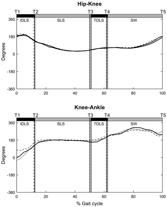 The relationship between the angular positions and velocities of one joint relative to another is a common representation of inter-joint coordination involving the interplay between efferent motor control and afferent joint receptors [18]. Information on inter-joint coordination helps investigate how redundant degrees of freedom of the joints in the neuromusculoskeletal system are organized to achieve smooth, accurate, and efficient functional movement [19]. With the relative phase analysis method incorporating joint position and velocity information, the patterns and variabilities of inter-joint coordination during functional movement in various populations have been studied, including healthy young adults, older adults, and patients with diseases or injuries [11,20]. The variability observed in the relative phase plots from repeated trials served as an indicator of the stability of inter-joint coordination [20]. Generally, reduced variability is considered a lack of flexibility, while excessive variability may be associated with injury, injury risks, or conditions changing motor control patterns [18]. Considering the residual gait deviations in patients with an early reduction in unilateral DDH [13], different inter-joint coordination patterns with greater variability during level walking may be expected. More insight into lower limb inter-joint coordination may help explain the harmful loading rates around heel strike observed in patients with early reduction for unilateral DDH [17].
