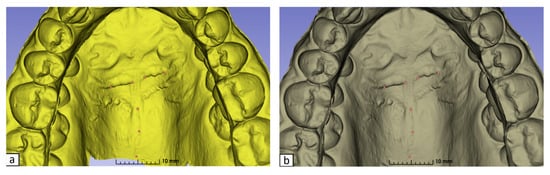 The palate is considered a consistent reference structure to obtain accurate superimposition of 3D models of the maxillary arch []. The stability of palatal landmarks during orthodontic treatment with or without miniscrew reference points was compared with classic lateral radiographs [,,,,,]. The aforementioned landmarks, including the medial half of the third palatal rugae and the mid-palatal raphe, have been established in five-year longitudinal studies and can, therefore, serve as stable landmarks [,,,,].