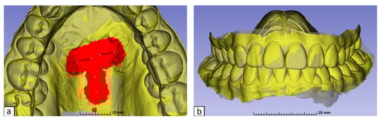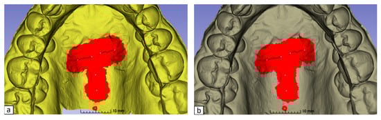 Superimposition on the identified ROI from the occlusal (a) and frontal (b) view.