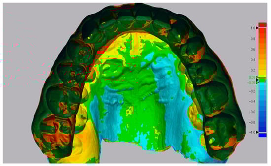 The T0 and T1 .stl files were superimposed using three different methods using two specialized software programs. Method 1 used 3D Slicer (CMF 5.0, www.slicer.org (accessed on 7 July 2025)) to identify palatal ridges as stable landmarks. Methods 2 and 3 used the best-fit algorithm in Geomagic Control X (version 2020.1.1, 3D Systems, © Inc., Rock Hill, SC, USA), which aligns 3D models by minimizing surface distances without requiring an initial global alignment. The reliability of this approach has been validated by Stucki and Gkantidis []. Of note, all the methods were consistently applied by an experienced operator using the same digital models.