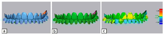 Overlay using method 3, upper arch. Control group patient. From left to right: scan at T0 (a), scan at T1 (b), and color map of the best-fit superimposition of the single upper arch (c).