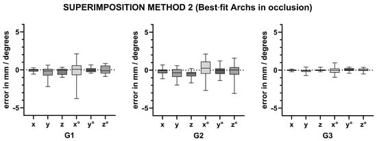 The analysis of patients without planned sagittal corrections (G1) shows that the automatic best-fit superimposition of arches locked in occlusion produces results very comparable to those obtained by palatal superimposition. In particular, the superimposition of arches in occlusion produces more accurate results than the superimposition of individual arches. Specifically, differences were observed in spatial positions along the y-axis (sagittal axis) and z-axis (vertical axis), as well as rotational orientation along the x-axis (roll axis), compared to palatal superimposition. However, rotational orientation along the y-axis (pitch axis) was accurate for both methods 2 and 3, with method 2 (arches in occlusion) demonstrating greater accuracy than method 3 in terms of latero-lateral positioning and rotational alignment.