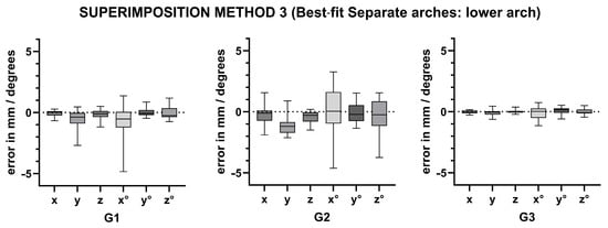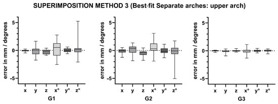 Since the range of differences between superimposition methods relative to the standard can include both positive and negative values, the absolute values of these differences were used in the analysis. This was performed to avoid a median close to zero, which could obscure statistically significant differences [].