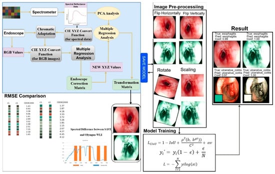 HSI is an emerging medical imaging technique that captures and processes information across the electromagnetic spectrum, providing detailed spectral and spatial data about biological tissues. HSI operates by acquiring images at numerous narrow wavelength bands, producing a three-dimensional dataset—known as a hypercube—with two spatial dimensions (X and Y) and one spectral dimension (λ) PMC [21]. The HSI device captures images with hundreds of spectral bands, and this rich spectral information enhances the contrast differentiation between normal and abnormal tissues, thus actually facilitating better detection and diagnosis. The primary HSI acquisition methods can be classified into spectral scanning, spatial scanning, and snapshot techniques. Spectral scanning captures images sequentially at different wavelengths. In contrast, spatial scanning acquires spatial information line by line across the scene, while snapshot techniques capture the whole spectral and spatial information in one exposure for real-time imaging [22,23]. For instance, the study used HSI with deep learning (DL) to accurately identify the geographical origins of Lycium barbarum L. (L. barbarum, Goji berry), 97.79% accuracy was achieved with improvements of 4.41% and 5.14% [24]. Another work shows that contact-free HSI has potential utility as a novel tool for free real-time monitoring of human pancreatic grafts, which could improve the outcome of pancreas transplantation [25]. However advantageous these methods may be, they mostly require costly, specialized equipment like advanced cameras and accurate calibration systems, which becomes even more difficult to afford and complex to run in a clinical environment [26]. For this issue, NBI was developed as an alternative that is far more suitable for practical applications. NBI utilizes specific wavelength bands to enhance the visualization of mucosal and vascular patterns without the need for complex instrumentation [27]. It makes use of a specific narrow spectrum of light blue (415 nm) to green (540 nm), which has a power penetrating superficial layers of mucosa [28]. This increases superficial tissue contrast, assisting in the detection of lesions through light filtration within narrow bands. Recent developments make it possible to produce endoscopic NBI-like images from regular WLI by way of hyperspectral data, which improves NBI-like image quality and diagnostic accuracy during endoscopic procedures [29,30]. A study that focuses on describing sinonasal mucosa under white light and NBI of 103 patients (82 evaluated) with 29 sinonasal pathologies and 55 controls (33 evaluated), 80.6% vs. 90.6% specificity, and 53% vs. 80.3% accuracy was calculated for both WLI and NBI consecutively [31]. Hence, in this study, NBI has been coupled with HSI to selectively augment certain spectral bands, creating a contrast enhancement for the identification of colorectal diseases and esophagitis in earlier stages. Using the SAVE model, this work will also train various ML algorithms applied to the dataset so as to create an effective system for the detection and prevention of precancerous and inflammatory conditions. The WLI images from the dataset have been SAVE-transformed to allow future training and analysis. NBI and hardware-driven HSI endoscopy can improve contrast, but they require specialized equipment and come with high costs and integration problems. Researchers have looked into methods that are only based on software, but they haven’t fully studied them in a rigorous way to predict spectrum standardization or a multi-type disease of GI cancer. In this study, using a software-only SAVE to fill in this gap is suggested. It uses standard WLI to create HSI-inspired images, adds a PCA and regression-based calibration to maintain clinical spectral characteristics, and works with deep learning classifiers to give a correct diagnosis of GI disease in four categories.