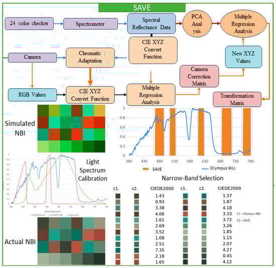 In the calibration process, it is important to guarantee a close match between each of the images of the SAVE and all of the images of the NBI, done by using the X-Rite Color Checker and caught by Olympus’s endoscope (Tokyo, Japan). Principal component analysis (PCA) helped in the determination of all exceptionally important components found in the reflectance spectra information; this subsequently reduced each dimension of the data and considerably improved computational efficiency. The PCA results indicated that six principal components accounted for practically all (99.64%) of the variance in the data. This quantity was certainly sufficient for a color calibration that was both effective and accurate. A minimal color difference was seen. The calibration recorded a mean root mean square error (RMSE) of 0.19 between the calibrated color (XYZcorrect) along the spectrometer output (XYZspectrum). This calibration process is quite important in converting all WLI images to HSI images and then transforming all of them into NBI images, which stimulates an improved level of tissue visualization, similar to narrow-band imaging. Multiple regression analysis was done to further assist in changing images. The transformation matrix equation in 3 helped to thoroughly define the correlation among all of the variables. This important transformation matrix adjusts the image spectra to obtain SAVE from WLI images.