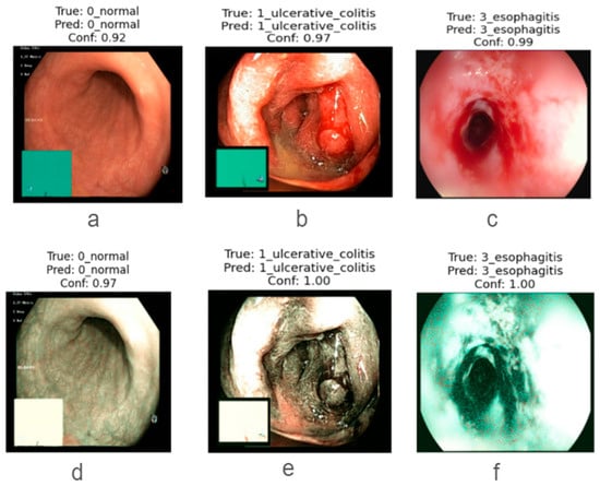 Representative endoscopic frames showing the effect of SAVE enhancement across three GI categories. Top row: original white-light images of (a) healthy mucosa, (b) ulcerative colitis, and (c) esophagitis. Bottom row: corresponding SAVE-enhanced outputs for (d) healthy mucosa, (e) ulcerative colitis, and (f) esophagitis. All images were processed by the InceptionV3-based classifier, illustrating how SAVE improves contrast and delineation of mucosal and vascular features critical for accurate disease detection.