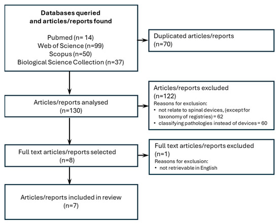 - Review of the literatureA comprehensive online search was conducted by LS to identify the taxonomies used by spinal registries. MEDline/PubMed, Biological Science Collection (ProQuest), Scopus, Web of Science (Science and Social Science databases, Science and Social Sciences Conferences), and grey literature databases were searched; no publication language limitation was set (the search strategies are available as Supplementary Materials). Records were deduplicated by VM and MT, who then screened and selected the articles or reports based on their titles and abstracts. The remaining articles or reports were then assessed for eligibility by full-text reading.Articles and reports were excluded if they: (1) did not relate to spinal devices, except for those that considered taxonomies in named active national registries; (2) classified pathologies instead of devices; and (3) were not retrievable in English as full text.