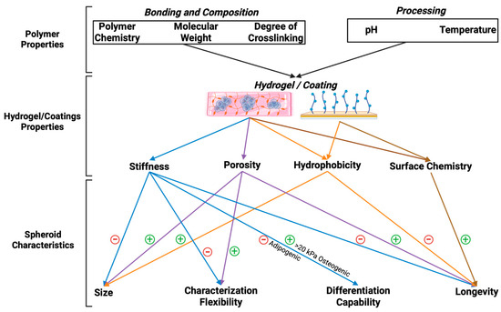 Figure 4 shows the multifaceted relationship between biomaterial properties, cellular responses, and processing parameters. These parameters collectively govern the functionality and success of engineered tissue constructs. Fundamental biomaterial characteristics, including stiffness, porosity, hydrophobicity, and surface chemistry, serve as key regulators of cellular behaviors such as adhesion, proliferation, migration, and differentiation. These properties, in turn, directly influence spheroid morphology, differentiation potential, and longevity, which are crucial for maintaining cellular viability and function in three-dimensional culture systems. Additionally, processing parameters, such as polymer molecular structure, the degree of polymerization, and thermal processing, significantly impact the physicochemical properties of biomaterials, further modulating their bioactivity. For instance, the tunability of hydrogel stiffness and porosity can facilitate precise control over nutrient diffusion and cellular infiltration, thereby optimizing the microenvironment for cell growth and matrix deposition. Furthermore, surface modifications, such as functionalization with bioactive ligands, enable enhanced biomimicry of the native ECM, thereby improving cell–material interactions and promoting tissue-specific differentiation.