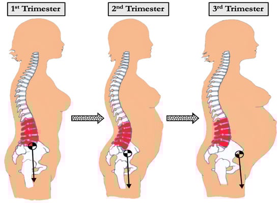 In addition to spinal curvature changes, pregnancy introduces biomechanical challenges to postural stability. As gestation progresses, the anterior shift in the center of mass requires neuromuscular compensation to maintain balance. This adaptation is reflected in center of pressure (CoP) displacement during static stance, with studies showing a consistent anterior shift in CoP and increased sway area in pregnant individuals compared to non-pregnant controls, changes indicative of reduced postural control [9]. These balance alterations may be associated with the development or exacerbation of low back pain, though individual variability in compensatory strategies appears substantial. Dynamic assessments show that postural stability declines further in late pregnancy, particularly during gait initiation and transitions. In a motion analysis study, McCrory et al. demonstrated that women in their third trimester exhibited poorer dynamic balance scores and delayed neuromuscular responses during walking compared to non-pregnant controls, suggesting increased instability during daily activities [24]. Gait analysis studies have produced mixed findings; while some report no significant changes in walking velocity or stride length, others have observed reduced velocity, wider stride, and altered joint kinematics, including increased hip flexion and reduced ankle plantarflexion [16,17,25]. These discrepancies are likely due to individual differences in trunk control and neuromuscular adaptation, as supported by Krkeljas, who found that reduced trunk stiffness and compensatory gait changes were common responses to gestational biomechanical demands [26]. These findings illustrate that pregnancy significantly affects both static and dynamic balance mechanisms, contributing to the multifactorial etiology of low back pain and underscoring the need for individualized assessment and preventive intervention. In summary, these postural and neuromuscular adjustments though protective in nature appear to impose a cumulative mechanical load that may underlie the increased prevalence of musculoskeletal discomfort and spinal pathology in later pregnancy stages or postpartum.