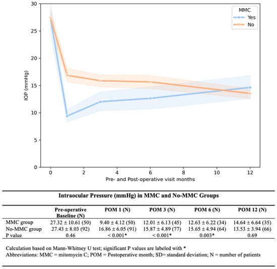 The MMC group showed significantly lower IOP at 1, 3, and 6 months post-operatively. The IOP difference diminished with each time point, and by 12 months, the difference was no longer observed (
