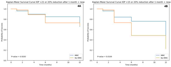 p = 0.928 by log-rank test). However, using IOP > 15 mmHg as a criterion, the MMC group had a higher cumulative success rate (48%) compared to the No-MMC group (32%,
