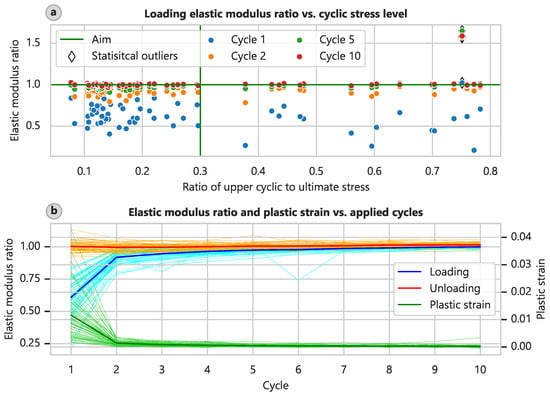 The elastic modulus measured during loading increased with cycle number relative to that in the final phase, which was largely independent of the loading level. This observation aligns with our initial assumption that cyclic preloading leads to collagen fiber alignment and thus stiffening.
