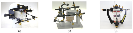 CADIAX 4 and Condylar Position Variator (CPV). (a) Kinematic facebow mounted on dental manikin; (b) mounted upper model on kinematic facebow; (c) mounted models on CPV. CADIAX 4, kinematic facebow and CPV: Gamma-dental, Klosterneuburg (GAMMA Medizinisch-wissenschaftliche Fortbildungs-GmbH) Klosterneuburg, Austria.