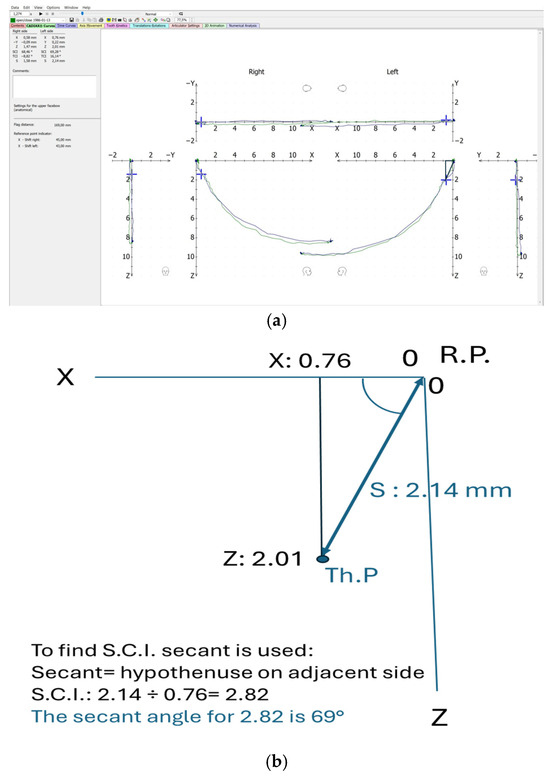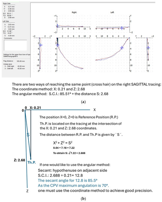 Condylography and coordinate method. (a) How to calculate Th.P on the right side; (b) calculation for the coordinate method.