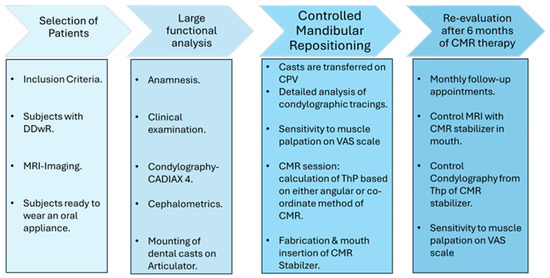 Out of the 20 subjects, 17 patients presented bilateral ADDwR, and the remaining 3 patients presented with ADDwR on one side and ADDw/oR on the other side. All the subjects enrolled in the study had to undergo the standard anamnesis, which included detailed records of each subject’s medical and dental history, the INFORM DC-TMD (https://inform-iadr.com/ (accessed on 29 February 2024)) protocol evaluation of joint clicking, acquisition of dental impression and the fabrication of split dental casts, TMJ MRI, palpation of muscles and TMJ structures, visual analogue scale, and condylography. (This information is from the first paper on MRI part of CMR method published in 2024) [33].
