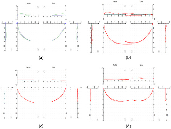 Sample condylography of one of the subjects before CMR therapy. (a) Protrusion–retrusion before treatment; (b) open–close before treatment; (c) protrusion–retrusion after CMR treatment; (d) open–close after CMR treatment.