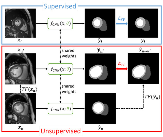 - Bortsova, G.; Dubost, F.; Hogeweg, L.; Katramados, I.; de Bruijne, M. Semi-supervised Medical Image Segmentation via Learning Consistency Under Transformations. In Proceedings of the Medical Image Computing and Computer Assisted Intervention–MICCAI 2019, Shenzhen, China, 13–17 October 2019; Springer International Publishing: Cham, Switzerland, 2019; pp. 810–818. [Google Scholar] [CrossRef]