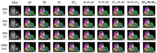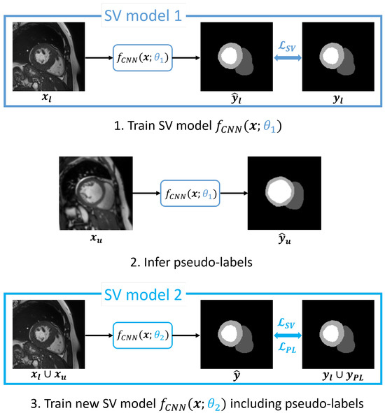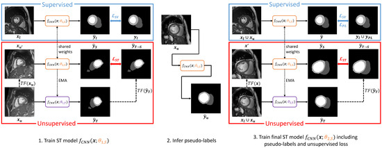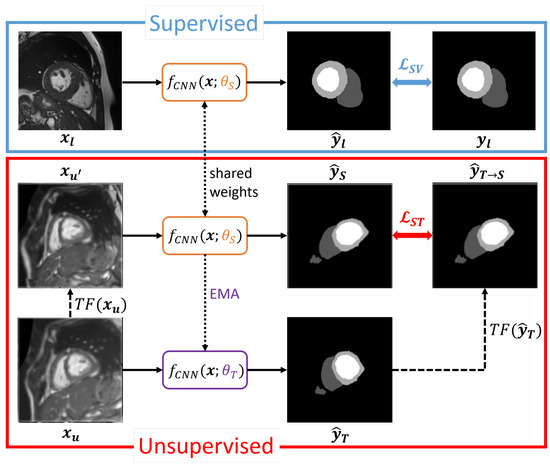 - Bai, W.; Oktay, O.; Sinclair, M.; Suzuki, H.; Rajchl, M.; Tarroni, G.; Glocker, B.; King, A.; Matthews, P.M.; Rueckert, D. Semi-supervised learning for network-based cardiac MR image segmentation. In Proceedings of the Medical Image Computing and Computer Assisted Intervention–MICCAI 2017, Quebec City, QC, Canada, 11–13 September 2017; Lecture Notes in Computer Science. Springer International Publishing: Cham, Switzerland, 2017; pp. 253–260. [Google Scholar] [CrossRef]