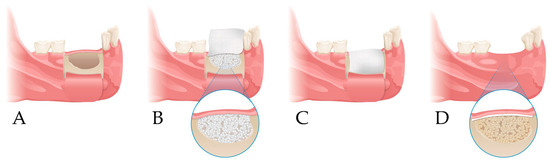 Study design. (A) Elevation of a periosteal flap and cyst enucleation; (B) xenogenic bone grafting at the bone defect site; (C) coverage with collagen membrane; (D) follow-up.