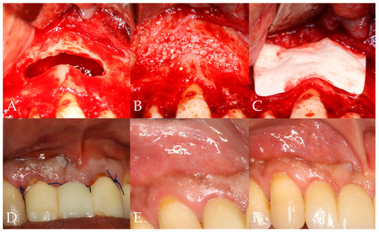 Clinical study protocol. (A) Cyst enucleation (2nd visit); (B) bone grafting at the defect site (2nd visit); (C) coverage with collagen membrane (2nd visit); (D) suture removal (3rd visit); (E) 3-month follow-up (4th visit); (F) 6-month follow-up (5th visit).