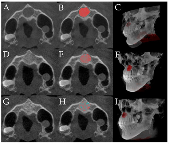 The entire volumetric evaluation process, including segmentation and three-dimensional reconstruction of the defect (red-highlighted), grafted bone, and newly formed bone (grafted bone + newly formed bone; green-highlighted) at three time points (3DSlicer, Slicer Community, TX, USA): preoperative (A–C), immediate postoperative (D–F), and 6-month follow-up (G–I).; (A) preoperative image; (B) preoperative distinction of defect area; (C) preoperative 3D construction of the defect area; (D) immediate postoperative image; (E) postoperative delineation of the grafted bone area; (F) postoperative 3D reconstruction of the grafted bone area; (G) image at the 6-month follow-up; (H) delineation of the grafted and newly formed bone area at the 6-month follow-up; (I) 3D reconstruction of the grafted and newly formed bone area at the 6-month follow-up.