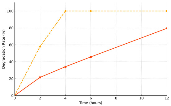 Remaining membrane weight (%) over time; group A (non-cross-linked membrane; yellow dashed line); group B (cross-linked membrane; orange line); group B retained more than 20% of its original mass even at 12 h, whereas group A was fully degraded by 4 h.